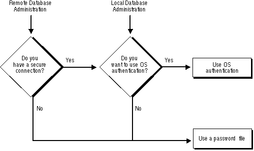 Depending on whether you wish to administer your database locally on the same machine that the database resides or if you wish to administer many different databases from a single remote client, you can choose between operating system authentication or password files to authenticate database administrators. Figure 1 - 1 illustrates the choices you have for database administrator authentication schemes.