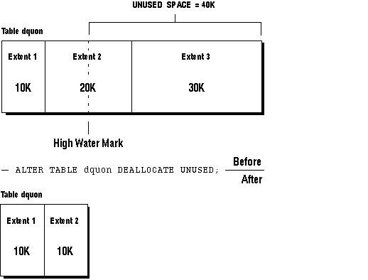 Table dquon consists of three extents (see figure Figure 10 - 3). The first extent is 10K, the second is 20K, and the third is 30K. The high water mark is in the middle of the second extent, and there is 40K of unused space. The following statement deallocates all unused space, leaving table dquon with two remaining extents. The third extent disappears, and the second extent size is 10K.