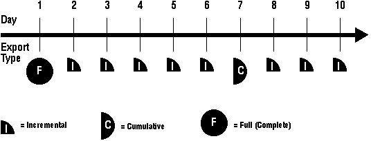 A complete export was taken on Day 1, a cumulative export was taken every week, and incremental exports were taken daily.