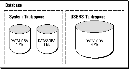 Databases, Tablespaces, and Datafiles The relationship among databases, tablespaces, and datafiles (datafiles are described in the next section) is illustrated in Figure 1 - 2.