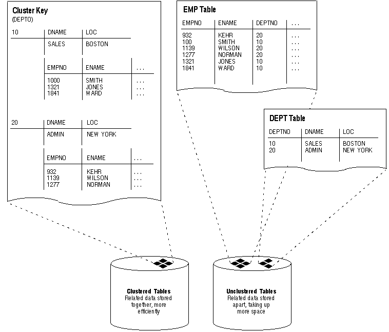 The related columns of the tables in a cluster are called the cluster key. The cluster key is indexed so that rows of the cluster can be retrieved with a minimum amount of I/O. Because the data in a cluster key of an index cluster (a non-hash cluster) is stored only once for multiple tables, clusters may store a set of tables more efficiently than if the tables were stored individually (not clustered). Figure 1 - 3 illustrates how clustered and non-clustered data is physically stored.