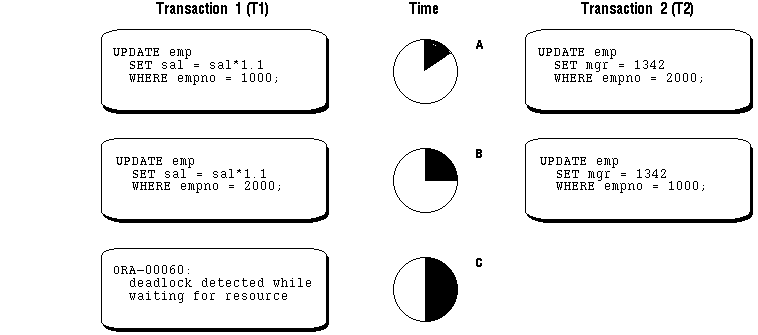 In Figure 10 - 1, no problem exists at time point A, as each transaction has a row lock on the row it attempts to update. Each transaction proceeds (without being terminated). However, each tries to update the row currently held by the other transaction. Therefore, a deadlock results at time point B, because neither transaction can obtain the resource it needs to proceed or terminate. It is a deadlock because no matter how long each transaction waits, the conflicting locks are held.
