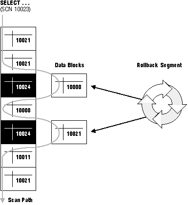 As a query enters the execution stage, the current system change number (SCN) is determined; in Figure 10 - 2, this system change number is 10023. As data blocks are read on behalf of the query, only blocks written with the observed system change number are used. Blocks with changed data (more recent SCNs) are reconstructed using data in the rollback segments, and the reconstructed data is returned for the query. Therefore, each query returns all committed data with respect to the SCN recorded at the time that query execution began. Changes of other transactions that occur during a query's execution are not observed, guaranteeing that consistent data is returned for each query.