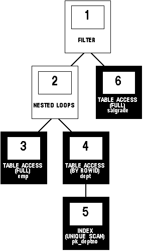 Each step of the execution plan returns a set of rows that either are used by the next step or, in the last step, returned to the user or application issuing the SQL statement. A set of rows returned by a step is called a row source. Figure 13 - 1 is a hierarchical diagram showing the flow of rows from one step to another. The numbering of the steps reflects the order in which they are shown when you view the execution plan, as described in the section "The EXPLAIN PLAN Command", on 13-5. This generally is not the order in which the steps are executed.
