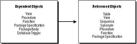 Some types of schema objects can reference other objects as part of their definition. For example, a view is defined by a query that references tables or other views; a procedure's body can include SQL statements that reference other objects of a database. An object that references another object as part of its definition is called a dependent object, while the object being referenced is a referenced object. Figure 16 - 1 illustrates the different types of dependent and referenced objects.