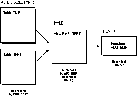 Oracle manages all local dependency checking using the database's internal "depends-on" table, which keeps track of each object's dependent objects. When a referenced object is modified, Oracle uses the depends-on table to identify dependent objects, which are then invalidated. For example, assume that there is a stored procedure UPDATE_SAL that references the table JWARD.EMP. If the definition of the table is altered in any way, the status of every object that references JWARD.EMP is changed to INVALID, including the stored procedure UPDATE_SAL. This implies that the procedure cannot be executed until the procedure has been recompiled and is valid. Similarly, when a DML privilege is revoked from a user, every dependent object in the user's schema is invalidated. However, an object that is invalid because authorization was revoked can be revalidated by "reauthorization", which incurs less overhead than a full recompilation.