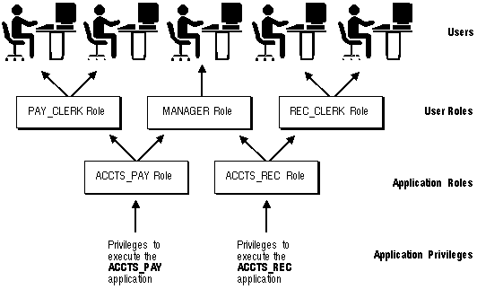 In general, you create a role to serve one of two purposes: to manage the privileges for a database application or to manage the privileges for a user group. Figure 18 - 1 and the sections that follow describe the two uses of roles.