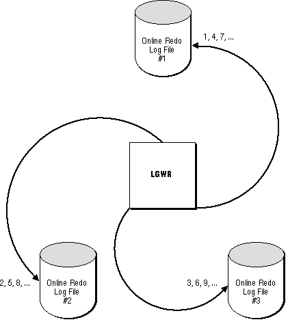 LGWR writes to online redo log files in a circular fashion; when the current online redo log file is filled, LGWR begins writing to the next available online redo log file. When the last available online redo log file is filled, LGWR returns to the first online redo log file and writes to it, starting the cycle again. Figure 22 - 1 illustrates the circular writing of the online redo log file. The numbers next to each line indicate the sequence in which LGWR writes to each online redo log file.