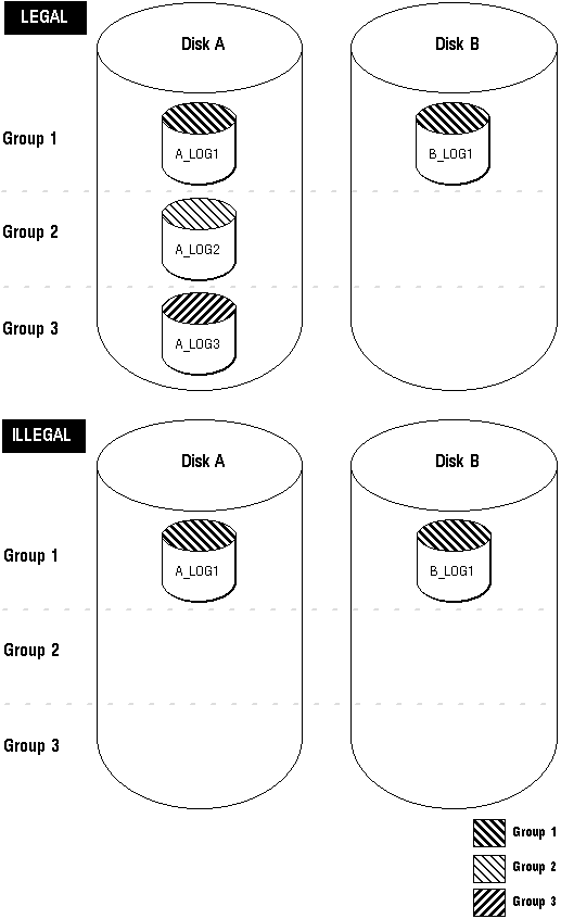 Figure 22 - 3. Legal and Illegal Multiplexed Online Redo Log Configuration