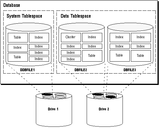 Schema objects are logical data storage structures. Schema objects do not have a one-to-one correspondence to physical files on disk that store their information. However, Oracle stores a schema object logically within a tablespace of the database. The data of each object is physically contained in one or more of the tablespace's datafiles. For some objects such as tables, indexes, and clusters, you can specify how much disk space Oracle allocates for the object within the tablespace's datafiles. Figure 5 - 1 illustrates the relationship among objects, tablespaces, and datafiles.