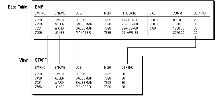 For example, Figure 5 - 5 shows how the STAFF view does not show the SAL or COMM columns of the base table EMP.