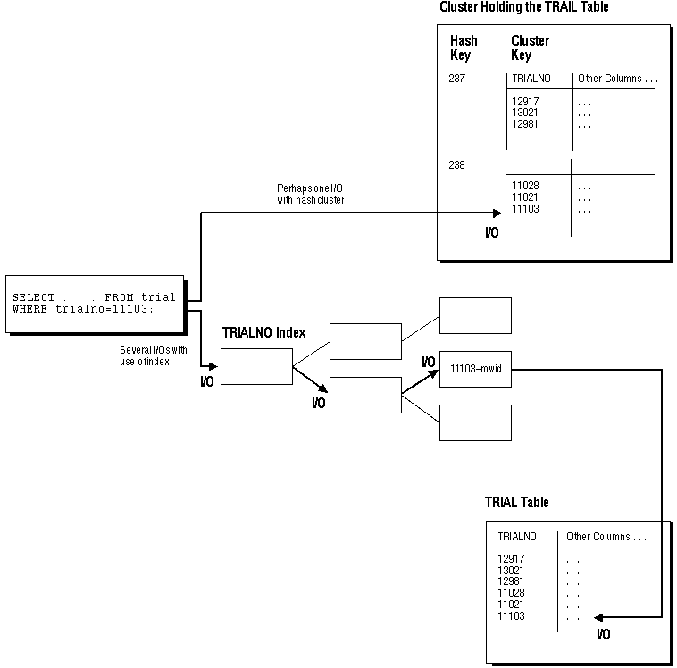 Figure 5 - 9 illustrates data retrieval for a table in a hash cluster as well as a table with an index. The following sections further explain the internal operations of hash cluster storage.