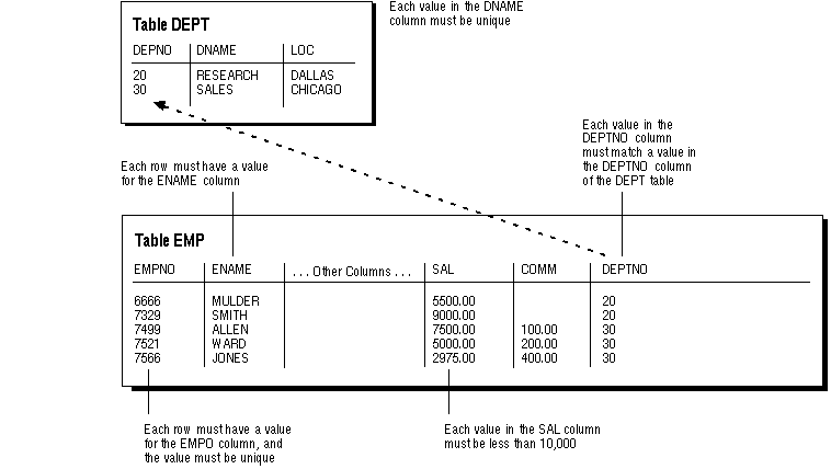 It is important that data adhere to a predefined set of rules, as determined by the database administrator or application developer. As an example of data integrity, consider the tables EMP and DEPT and the business rules for the information in each of the tables, as illustrated in Figure 7 - 1.
