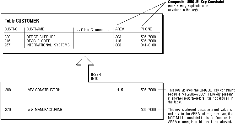 If the UNIQUE key constraint is comprised of more than one column, that group of columns is said to be a composite unique key. For example, in Figure 7 - 4, the CUSTOMER table has a UNIQUE key constraint defined on the composite unique key: the AREA and PHONE columns.