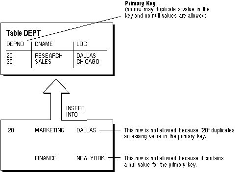 Figure 7 - 5 illustrates a PRIMARY KEY constraint in the DEPT table and examples of rows that the constraint prevents from entering the table.