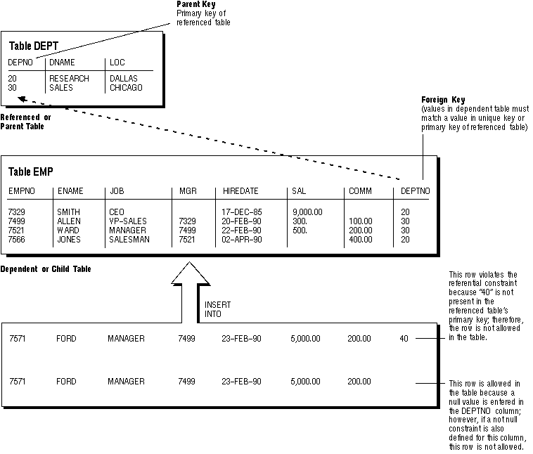 Figure 7 - 6 shows a foreign key defined on the DEPTNO column of the EMP table. It guarantees that every value in this column must match a value in the primary key of the DEPT table (the DEPTNO column). Therefore, no erroneous department numbers can exist in the DEPTNO column of the EMP table.