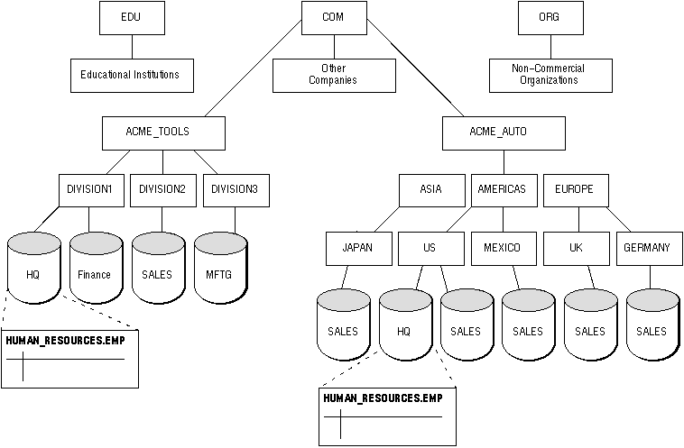 For example, consider the corporation shown in Figure 2 - 11. The sales organization (the SALES domain) could have a server named VAULT. The human resources group (the HR domain) could also have a server named VAULT. The global names of these servers would be unique. The finance group's server would have the global name