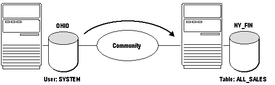 This query initiates a connection from OHIO to NY_FIN to the common account FINPUBLIC. The query is processed on NY_FIN, and data from the table ALL_SALES are returned to OHIO.