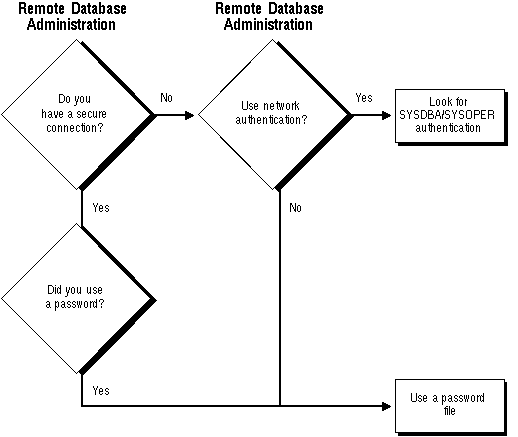 Authentication through network privileges alleviates the need to maintain a password file by providing network privileges that map to the operating system privileges (SYSDBA and SYSOPER). The DBA or network administrator can make remote administration over a non-secure connection possible by using network privileges. See Figure 6 - 2 for an illustration of authentication through