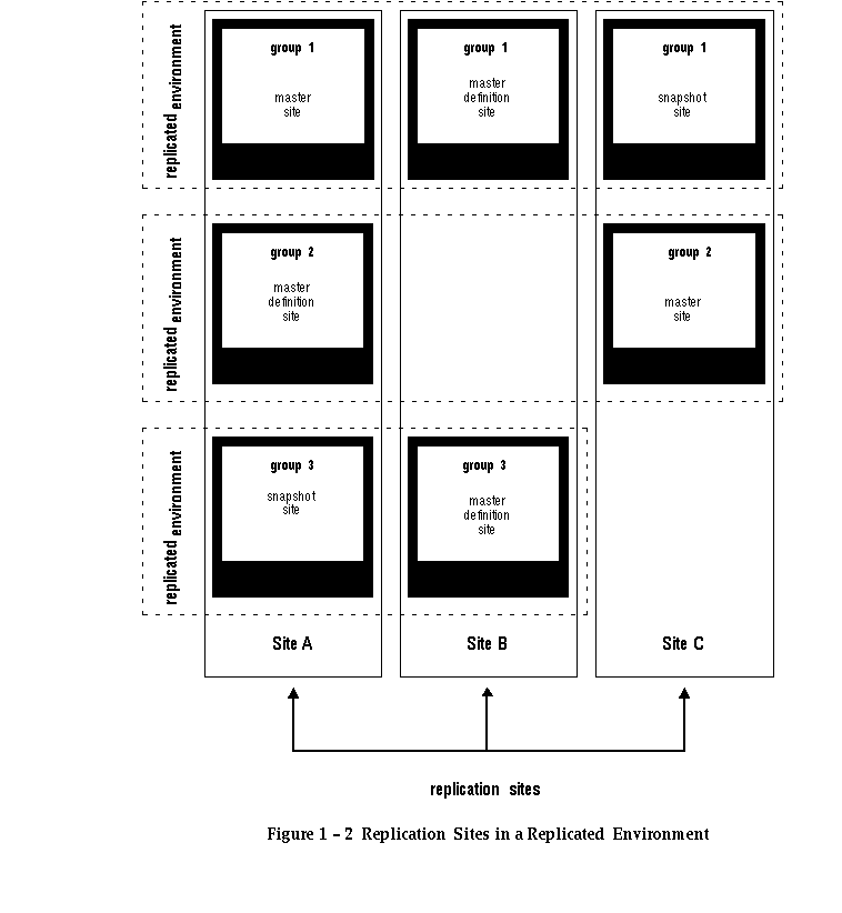 As shown in Figure 1 - 2, a replication site can participate in multiple replication groups. For example, Site A in Figure 1 - 2 is a snapshot site for schema 3, the master definition site for schema 2, and the master site for schema 1.