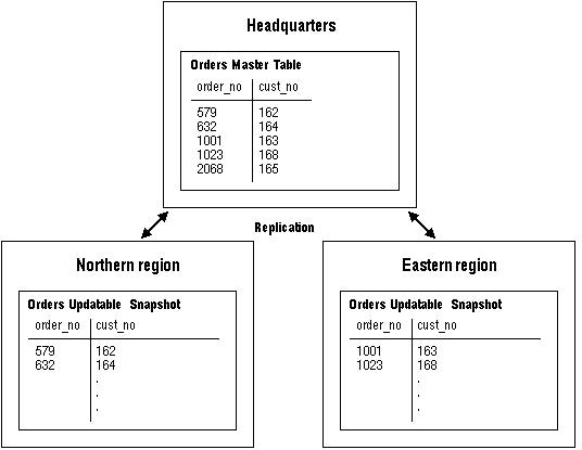You can think of the ORDERS snapshot at each of the sales offices as a writeable subset of the ORDERS table at headquarters.