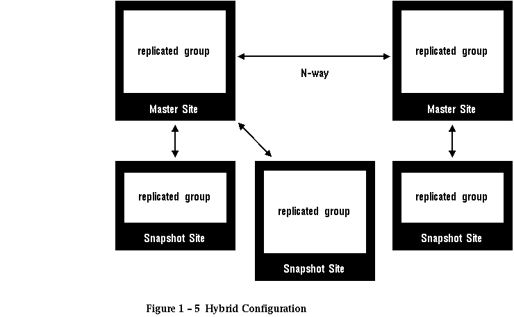 An added benefit of this n-way replication is that snapshots can be remastered from the other master sites to improve availability. If one master site fails, its snapshots can refresh themselves from the surviving master site and continue processing. This configuration, in which a master site resembles a "hub" with "spokes" to snapshot sites, also allows the two n-way connected master sites to function as fail-over sites for each other (see the "Survivability" section