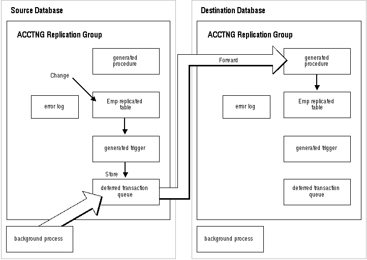 As shown in Figure 1 - 7, when you make a change to a replicated table, Oracle fires a trigger which calls a packaged procedure at each master site that applies the change.