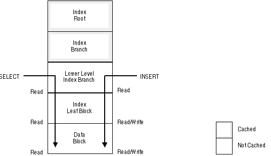For example, Figure 14 - 1 illustrates read and write access to data in a large table in which two levels of the index are not in the buffer cache and only a high level index is cached in the SGA.